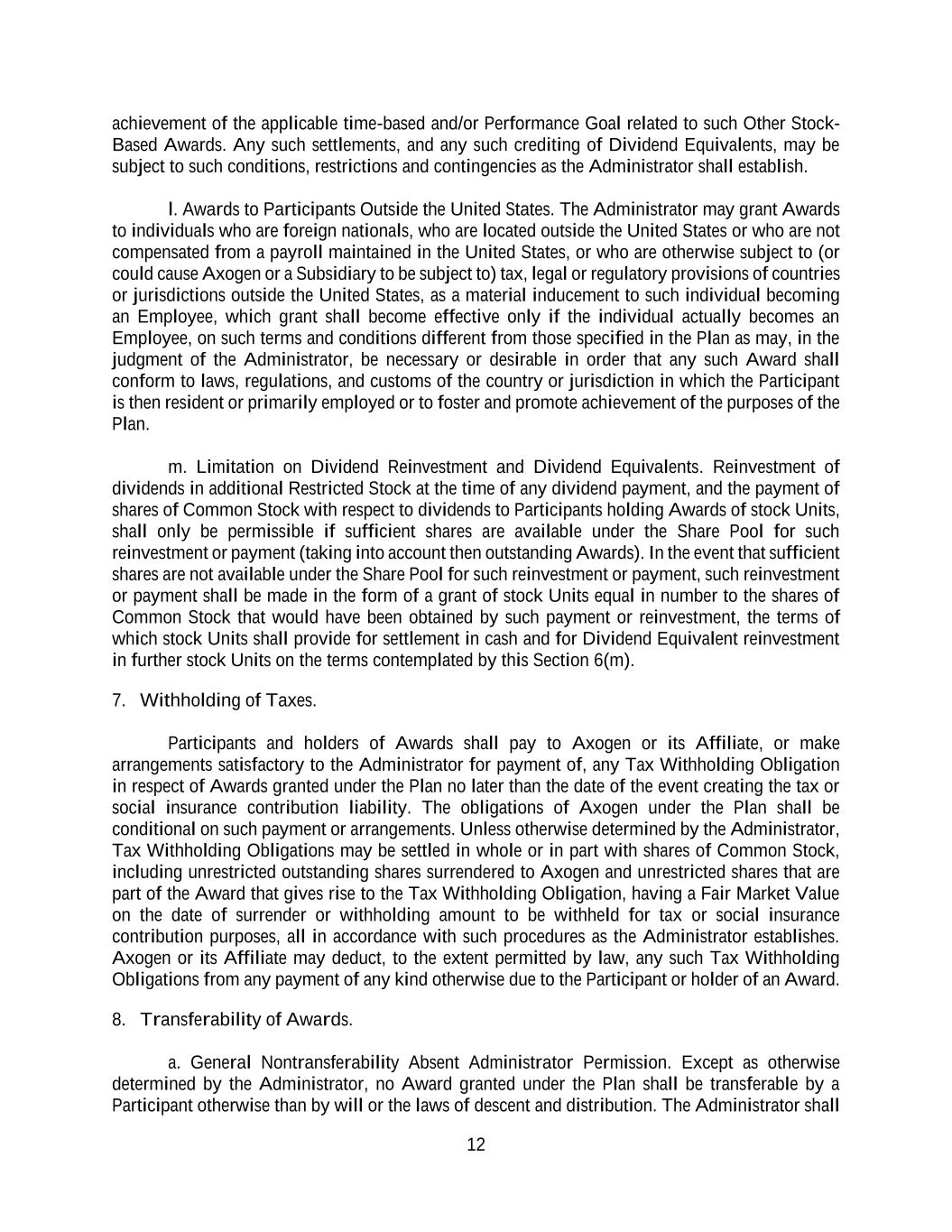12 achievement of the applicable time-based and/or Performance Goal related to such Other Stock- Based Awards. Any such settlements, and any such crediting of Dividend Equivalents, may be subject to such conditions, restrictions and contingencies as the Administrator shall establish. l. Awards to Participants Outside the United States. The Administrator may grant Awards to individuals who are foreign nationals, who are located outside the United States or who are not compensated from a payroll maintained in the United States, or who are otherwise subject to (or could cause Axogen or a Subsidiary to be subject to) tax, legal or regulatory provisions of countries or jurisdictions outside the United States, as a material inducement to such individual becoming an Employee, which grant shall become effective only if the individual actually becomes an Employee, on such terms and conditions different from those specified in the Plan as may, in the judgment of the Administrator, be necessary or desirable in order that any such Award shall conform to laws, regulations, and customs of the country or jurisdiction in which the Participant is then resident or primarily employed or to foster and promote achievement of the purposes of the Plan. m. Limitation on Dividend Reinvestment and Dividend Equivalents. Reinvestment of dividends in additional Restricted Stock at the time of any dividend payment, and the payment of shares of Common Stock with respect to dividends to Participants holding Awards of stock Units, shall only be permissible if sufficient shares are available under the Share Pool for such reinvestment or payment (taking into account then outstanding Awards). In the event that sufficient shares are not available under the Share Pool for such reinvestment or payment, such reinvestment or payment shall be made in the form of a grant of stock Units equal in number to the shares of Common Stock that would have been obtained by such payment or reinvestment, the terms of which stock Units shall provide for settlement in cash and for Dividend Equivalent reinvestment in further stock Units on the terms contemplated by this Section 6(m). 7. Withholding of Taxes. Participants and holders of Awards shall pay to Axogen or its Affiliate, or make arrangements satisfactory to the Administrator for payment of, any Tax Withholding Obligation in respect of Awards granted under the Plan no later than the date of the event creating the tax or social insurance contribution liability. The obligations of Axogen under the Plan shall be conditional on such payment or arrangements. Unless otherwise determined by the Administrator, Tax Withholding Obligations may be settled in whole or in part with shares of Common Stock, including unrestricted outstanding shares surrendered to Axogen and unrestricted shares that are part of the Award that gives rise to the Tax Withholding Obligation, having a Fair Market Value on the date of surrender or withholding amount to be withheld for tax or social insurance contribution purposes, all in accordance with such procedures as the Administrator establishes. Axogen or its Affiliate may deduct, to the extent permitted by law, any such Tax Withholding Obligations from any payment of any kind otherwise due to the Participant or holder of an Award. 8. Transferability of Awards. a. General Nontransferability Absent Administrator Permission. Except as otherwise determined by the Administrator, no Award granted under the Plan shall be transferable by a Participant otherwise than by will or the laws of descent and distribution. The Administrator shall