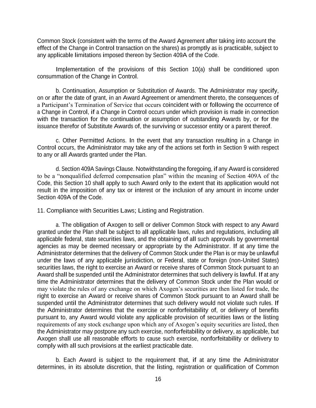 16 Common Stock (consistent with the terms of the Award Agreement after taking into account the effect of the Change in Control transaction on the shares) as promptly as is practicable, subject to any applicable limitations imposed thereon by Section 409A of the Code. Implementation of the provisions of this Section 10(a) shall be conditioned upon consummation of the Change in Control. b. Continuation, Assumption or Substitution of Awards. The Administrator may specify, on or after the date of grant, in an Award Agreement or amendment thereto, the consequences of a Participant’s Termination of Service that occurs coincident with or following the occurrence of a Change in Control, if a Change in Control occurs under which provision is made in connection with the transaction for the continuation or assumption of outstanding Awards by, or for the issuance therefor of Substitute Awards of, the surviving or successor entity or a parent thereof. c. Other Permitted Actions. In the event that any transaction resulting in a Change in Control occurs, the Administrator may take any of the actions set forth in Section 9 with respect to any or all Awards granted under the Plan. d. Section 409A Savings Clause. Notwithstanding the foregoing, if any Award is considered to be a “nonqualified deferred compensation plan” within the meaning of Section 409A of the Code, this Section 10 shall apply to such Award only to the extent that its application would not result in the imposition of any tax or interest or the inclusion of any amount in income under Section 409A of the Code. 11. Compliance with Securities Laws; Listing and Registration. a. The obligation of Axogen to sell or deliver Common Stock with respect to any Award granted under the Plan shall be subject to all applicable laws, rules and regulations, including all applicable federal, state securities laws, and the obtaining of all such approvals by governmental agencies as may be deemed necessary or appropriate by the Administrator. If at any time the Administrator determines that the delivery of Common Stock under the Plan is or may be unlawful under the laws of any applicable jurisdiction, or Federal, state or foreign (non-United States) securities laws, the right to exercise an Award or receive shares of Common Stock pursuant to an Award shall be suspended until the Administrator determines that such delivery is lawful. If at any time the Administrator determines that the delivery of Common Stock under the Plan would or may violate the rules of any exchange on which Axogen’s securities are then listed for trade, the right to exercise an Award or receive shares of Common Stock pursuant to an Award shall be suspended until the Administrator determines that such delivery would not violate such rules. If the Administrator determines that the exercise or nonforfeitability of, or delivery of benefits pursuant to, any Award would violate any applicable provision of securities laws or the listing requirements of any stock exchange upon which any of Axogen’s equity securities are listed, then the Administrator may postpone any such exercise, nonforfeitability or delivery, as applicable, but Axogen shall use all reasonable efforts to cause such exercise, nonforfeitability or delivery to comply with all such provisions at the earliest practicable date. b. Each Award is subject to the requirement that, if at any time the Administrator determines, in its absolute discretion, that the listing, registration or qualification of Common