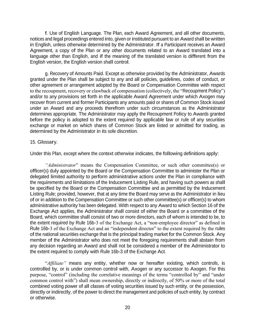 20 f. Use of English Language. The Plan, each Award Agreement, and all other documents, notices and legal proceedings entered into, given or instituted pursuant to an Award shall be written in English, unless otherwise determined by the Administrator. If a Participant receives an Award Agreement, a copy of the Plan or any other documents related to an Award translated into a language other than English, and if the meaning of the translated version is different from the English version, the English version shall control. g. Recovery of Amounts Paid. Except as otherwise provided by the Administrator, Awards granted under the Plan shall be subject to any and all policies, guidelines, codes of conduct, or other agreement or arrangement adopted by the Board or Compensation Committee with respect to the recoupment, recovery or clawback of compensation (collectively, the “Recoupment Policy”) and/or to any provisions set forth in the applicable Award Agreement under which Axogen may recover from current and former Participants any amounts paid or shares of Common Stock issued under an Award and any proceeds therefrom under such circumstances as the Administrator determines appropriate. The Administrator may apply the Recoupment Policy to Awards granted before the policy is adopted to the extent required by applicable law or rule of any securities exchange or market on which shares of Common Stock are listed or admitted for trading, as determined by the Administrator in its sole discretion. 15. Glossary. Under this Plan, except where the context otherwise indicates, the following definitions apply: “Administrator” means the Compensation Committee, or such other committee(s) or officer(s) duly appointed by the Board or the Compensation Committee to administer the Plan or delegated limited authority to perform administrative actions under the Plan in compliance with the requirements and limitations of the Inducement Listing Rule, and having such powers as shall be specified by the Board or the Compensation Committee and as permitted by the Inducement Listing Rule; provided, however, that at any time the Board may serve as the Administrator in lieu of or in addition to the Compensation Committee or such other committee(s) or officer(s) to whom administrative authority has been delegated. With respect to any Award to which Section 16 of the Exchange Act applies, the Administrator shall consist of either the Board or a committee of the Board, which committee shall consist of two or more directors, each of whom is intended to be, to the extent required by Rule 16b-3 of the Exchange Act, a “non-employee director” as defined in Rule 16b-3 of the Exchange Act and an “independent director” to the extent required by the rules of the national securities exchange that is the principal trading market for the Common Stock. Any member of the Administrator who does not meet the foregoing requirements shall abstain from any decision regarding an Award and shall not be considered a member of the Administrator to the extent required to comply with Rule 16b-3 of the Exchange Act. “Affiliate” means any entity, whether now or hereafter existing, which controls, is controlled by, or is under common control with, Axogen or any successor to Axogen. For this purpose, “control” (including the correlative meanings of the terms “controlled by” and “under common control with”) shall mean ownership, directly or indirectly, of 50% or more of the total combined voting power of all classes of voting securities issued by such entity, or the possession, directly or indirectly, of the power to direct the management and policies of such entity, by contract or otherwise.