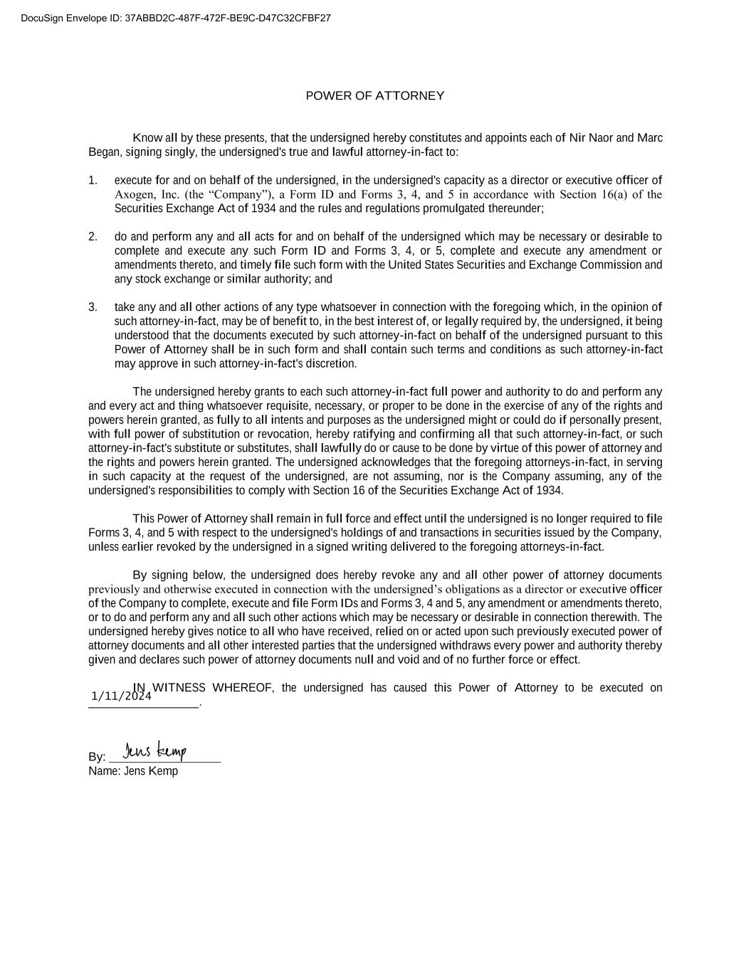 POWER OF ATTORNEY Know all by these presents, that the undersigned hereby constitutes and appoints each of Nir Naor and Marc Began, signing singly, the undersigned's true and lawful attorney-in-fact to: 1. execute for and on behalf of the undersigned, in the undersigned's capacity as a director or executive officer of Axogen, Inc. (the “Company”), a Form ID and Forms 3, 4, and 5 in accordance with Section 16(a) of the Securities Exchange Act of 1934 and the rules and regulations promulgated thereunder; 2. do and perform any and all acts for and on behalf of the undersigned which may be necessary or desirable to complete and execute any such Form ID and Forms 3, 4, or 5, complete and execute any amendment or amendments thereto, and timely file such form with the United States Securities and Exchange Commission and any stock exchange or similar authority; and 3. take any and all other actions of any type whatsoever in connection with the foregoing which, in the opinion of such attorney-in-fact, may be of benefit to, in the best interest of, or legally required by, the undersigned, it being understood that the documents executed by such attorney-in-fact on behalf of the undersigned pursuant to this Power of Attorney shall be in such form and shall contain such terms and conditions as such attorney-in-fact may approve in such attorney-in-fact's discretion. The undersigned hereby grants to each such attorney-in-fact full power and authority to do and perform any and every act and thing whatsoever requisite, necessary, or proper to be done in the exercise of any of the rights and powers herein granted, as fully to all intents and purposes as the undersigned might or could do if personally present, with full power of substitution or revocation, hereby ratifying and confirming all that such attorney-in-fact, or such attorney-in-fact's substitute or substitutes, shall lawfully do or cause to be done by virtue of this power of attorney and the rights and powers herein granted. The undersigned acknowledges that the foregoing attorneys-in-fact, in serving in such capacity at the request of the undersigned, are not assuming, nor is the Company assuming, any of the undersigned's responsibilities to comply with Section 16 of the Securities Exchange Act of 1934. This Power of Attorney shall remain in full force and effect until the undersigned is no longer required to file Forms 3, 4, and 5 with respect to the undersigned's holdings of and transactions in securities issued by the Company, unless earlier revoked by the undersigned in a signed writing delivered to the foregoing attorneys-in-fact. By signing below, the undersigned does hereby revoke any and all other power of attorney documents previously and otherwise executed in connection with the undersigned’s obligations as a director or executive officer of the Company to complete, execute and file Form IDs and Forms 3, 4 and 5, any amendment or amendments thereto, or to do and perform any and all such other actions which may be necessary or desirable in connection therewith. The undersigned hereby gives notice to all who have received, relied on or acted upon such previously executed power of attorney documents and all other interested parties that the undersigned withdraws every power and authority thereby given and declares such power of attorney documents null and void and of no further force or effect. IN WITNESS WHEREOF, the undersigned has caused this Power of Attorney to be executed on __________________. By: Name: Jens Kemp DocuSign Envelope ID: 37ABBD2C-487F-472F-BE9C-D47C32CFBF27 1/11/2024